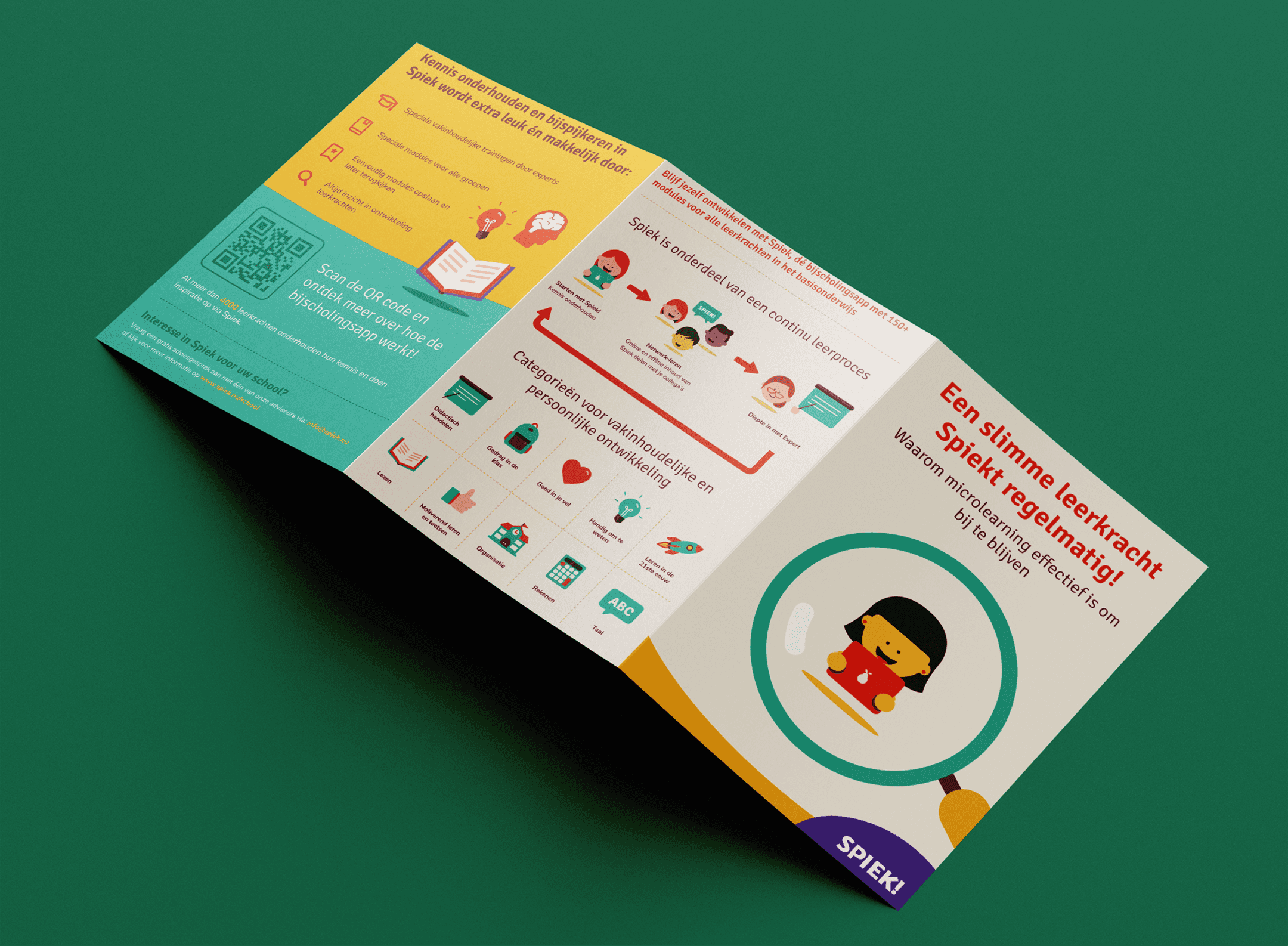 Met Spiek kunnen docenten in hun vrije tijd snel en makkelijk bijleren en op de hoogte blijven van de laatste trends in het basisonderwijs. Geen lange dagen met z'n allen in een zaal, maar lessen volgen wanneer het uitkomt. Onderweg in het OV of 's avonds op de bank. Spiek! geeft de vrijheid om zelf te bepalen wanneer en hoe je wilt bijleren en bijblijven.